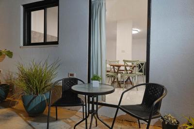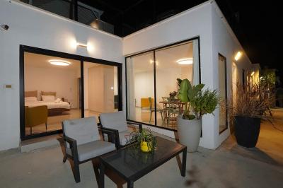 A modern and equipped boutique suite, especially pampering At the entrance to the suite you will discover a particularly high-quality double bed, offered with high-quality and soft linens. Next to it are chests of light shades, with cabinets for storing your personal belongings. There you can also turn on reading lights. In front of the bed is a TV on an adjustable stand for maximum comfort - which you can also turn to face the hot indoor jacuzzi waiting for you in the corner of the suite. You will also find a kitchenette with a coffee machine and quality capsules, a microwave, a set for making coffee and tea and more. Next to the kitchenette is a bar table for four. The suite is designed in a modern style, in shades of black and white, combined with wood. With warm designed bulbs, which complement the atmosphere. In the bathroom of the suites you will find a shower designed in a combination of black and glass, a toilet, and a sink with a storage cabinet - there you will also find soft and pleasant towels and bathrobes waiting for you.
